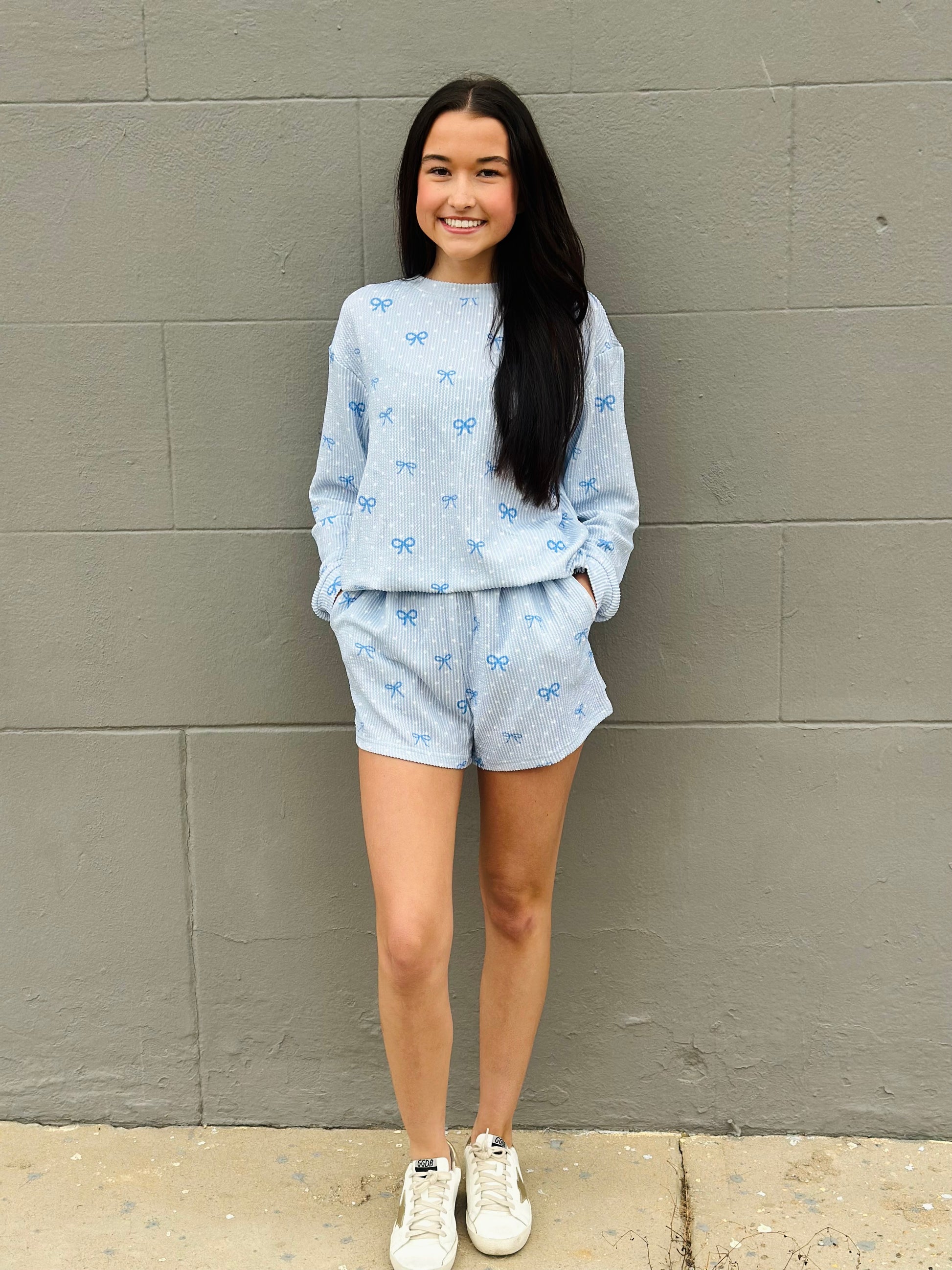 SKY BLUE BOW PRINT LOOSE FIT LONG SLEEVE SHORT SET